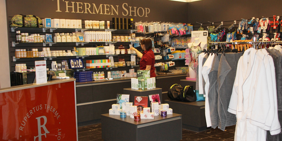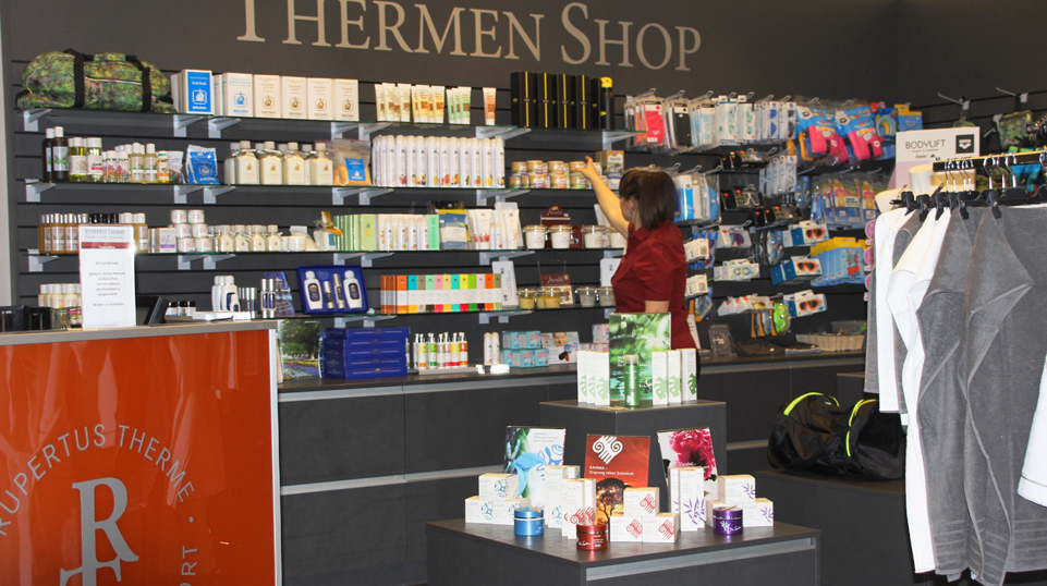 Der Thermen-Shop bietet eine kleine, aber feine Auswahl an Bademäntel, Handtücher, Bikinis, Badeanzügen und Badehosen bis hin zu den obligatorischen Badeschlappen. Ein zweiter Bereich ist den Pflegeprodukten gewidmet, von denen viele in der RupertusTherme selbst Anwendung finden. Sehr beliebt sind Duschgels und Pflegeprodukte mit Latschenkiefernextrakten, eine regionale Besonderheit mit der ‚Kraft der Natur‘. Die ist ebenso in den Laistprodukten zu finden. Dabei wird Laist, ein Gesteinsmehl aus dem Salzbergwerk Berchtesgaden, fein gemahlen und kosmetisch aufbereitet. Es spendet der Haut Mineralien und regt die Durchblutung an. Gut angenommen wird eine eigene Kosmetiklinie der Kur-GmbH mit dem Zusatz von Alpensole. Ein gern gekauftes Mitbringsel vieler Urlauber.