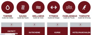 Es folgen aktuelle Informationen und mit schönen Fotos und kurzen Texten wird der Besucher auf das Erlebnis RupertusTherme eingestimmt. Die oberen Menüpunkte der Startseite führen in einfachen transparenten Schritten zu den speziellen Angeboten für die jeweiligen Bereiche der Therme. Sie sind klar strukturiert und damit für den Nutzer sehr anwenderfreundlich. Am Besten aber taucht man selbst in das Thermenvergnügen ein, nämlich in die Therme als Quelle des Salzes, in die Sauna als Quelle des Feuers, beim Wellness als Quelle der Muße, in die Fitness als Quelle der Energie, in das Familienbad als Quelle der Freude und die Therapie als Quelle der Erholung.