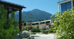 Offen mit viel Raum und südlichem Ambiente präsentiert sich der Saunagarten der RupertusTherme. Im Hintergrund der Hausberg von Bad Reichenhall, der Predigtstuhl.